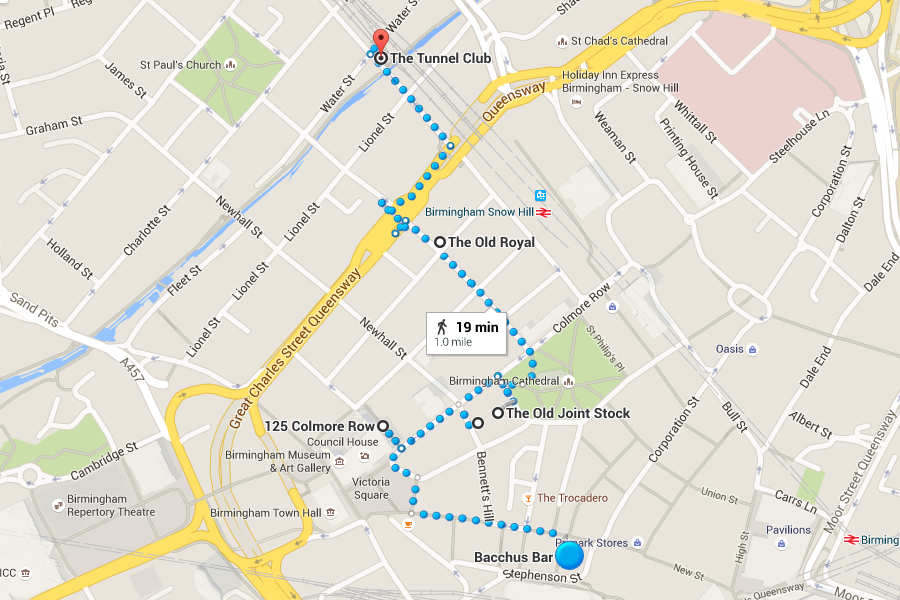 BIRMINGHAM'2 miles'8 bars'Brummy land is well known for its easy routes and access to alcohol. Our pub crawl is no exception! Start at Bacchus Bar and nip up to The Wellington. Go around the block to the Old Joint Stock, and then go all the way past the cathedral towards The Old Royal. Finally (safely) cross Great Charles Street Queensway towards your final destination, The Tunnel Club.