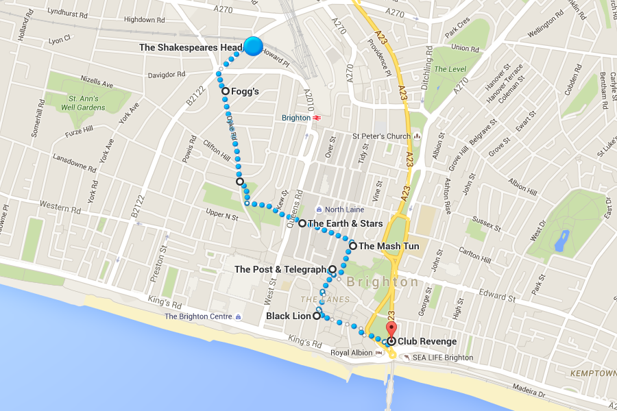 BRIGHTON'1 mile'6 bars'Fancy a pub crawl by the seaside? In Brighton, you can start in town at the Shakespeare's Head, go down Dyke Road by Fogg's, and, well, just keep going. Hit the Earth & Stars, The Mash Tun and The Post & Telegraph. This crawl ends at The Black Lion, though you could always jump into the sea if you really wanted a dip after all those beers! NOTE: don't swim drunk. Please. It's all fun and games until someone loses a best man.