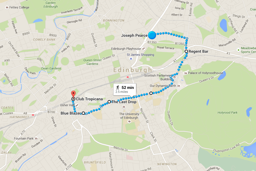 EDINBURGH'2.3 miles'5 bars'Another long walk that's worth it! Start at Joseph Pearce's, followed by the Regent Bar on Montrose Terrace. After this, you're going past the Scottish Parliament Building towards Holyrood Palace. Continue along to The Last Drop and finish off at Blue Blazer.