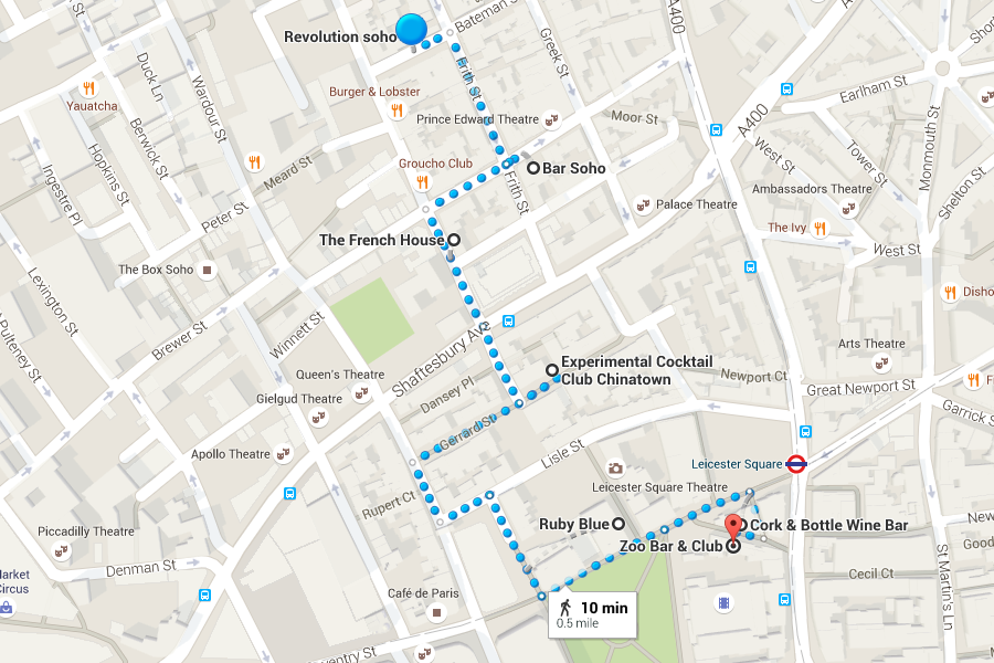 LONDON'0.6 mile'5 bars'Our first alcoholic gauntlet is thrown down in London's West End. Kick off the night at Revolution Soho with a cheeky couple of shots, then move on to Bar Soho to continue the evening's drinking. Next up is Rumba round the corner, and then it's down to Ruby Blue. End up in Zoo Bar to round off an epic night.