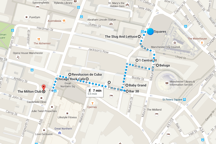 MANCHESTER'0.4 miles'9 bars'Short distance + large amount of bars = a legendary bar crawl! Got to give it to Harry Bongos and his stag do for showing us this legendary route, starting at the tried and tested Squares. After a beer here, move onto The Slug and Lettuce, then past the City Council to Beluga. Now you're on a non-stop street of bars! Go down to Bar 38, then BrewDog, moving onto Chicago Rock and Revolucion de Cuba. Finally, you're rocking up at The Milton Club!