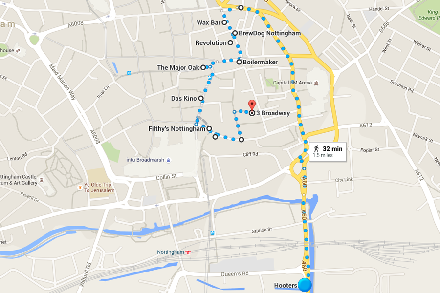 NOTTINGHAM'1.5 miles'9 bars The second bar crawl comes courtesy of Nottingham and we won't lie, there's a fair bit of walking in this one. However, stick with us and you'll be set for a legendary night out! What better way to start than at the one remaining Hooters in the UK? After this, you're off on a hike towards Wax Bar, BrewDog and Revolution on Broad Street. Next, it's the Boilermaker and drinks at one of the strangest bars ever (modelled to look like an actual boiler shop, you enter through a secret door in the staff toilet). And we're not finished yet. Hit Das Kino in the Lace Market area for a game of ping pong, followed by Filthy's and Pitcher & Piano. Last but not least, you've got an evening of messy times in Volt, Nottingham's newest club.