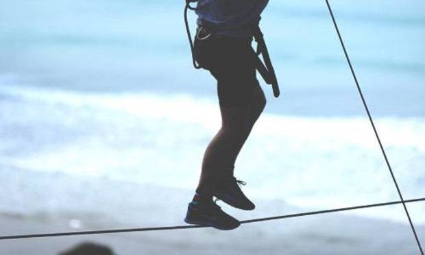 Take your first steps onto a 'tightwire' strung between two points on the cliffs overlooking a popular surf spot. It's 150 ft straight down! Do you dare to sneak a peak at the sand far below, as you wobble your way across the wire?